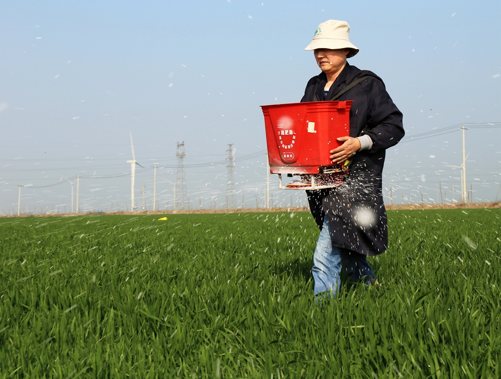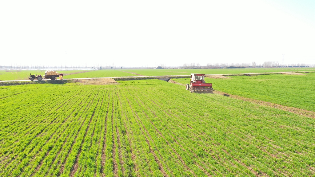 华阳河农场职工追施小麦返青肥 (李 龙 摄)