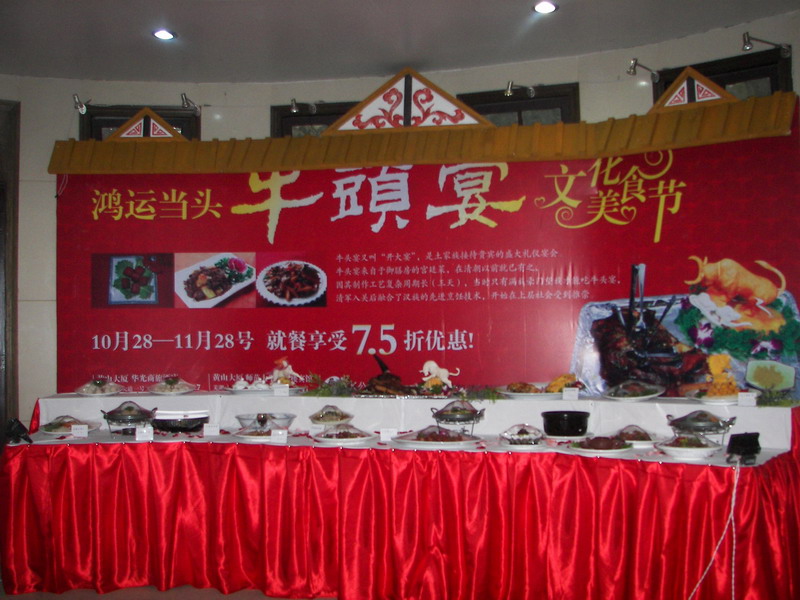 10月28日,安徽农垦黄山大厦KK公司第二届文化美食节活动——“2009鸿运当头牛头宴” 在黄山大厦华光商旅酒店和黄山大厦安徽师范大学专家楼宾馆两地隆重开幕。 本届美食节为期一个月,由牛头宴、蟹宴、鱼羊鲜三大系列活动组成。活动期间,还会向消费者推出特色手抓牛头、鱼羊鲜、金丝带鱼卷和干锅萝卜丝圆等具有土家族特色的美食。