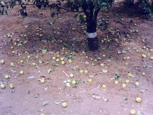 2004年7月6日凌晨零时50分,一场突如其来的狂风 暴雨夹杂着冰雹自西向东袭击砀山果园场,大风持 续近1个小时,最大风力在10级以上,冰雹持续8— 20分钟,其直径一般为2.2cm,个别直径达3cm以 上,密度平均每平方米500粒左右。大风、冰雹过 后,大量梨果、桃果、银杏、葡萄被刮落、砸伤, 重者果皮绽开、果肉粉碎,损失极为惨重,