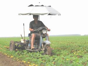 7月15日上午,潘村湖农场五分场职工余正奎正趁早 晨天气凉爽时间,驾驶自己改装的田间多功能作业 机,在自家的责任田里进行大豆田间中耕松土作业, 以促进大豆生长.这种在小型正三轮基础上改造的作 业设备可以进行喷药、施肥、中耕、锄草及播种作 业等,工效高、成本少,一台作业机每小时可施行 中耕作业或药剂喷施作业25-30亩,是家庭农场职工 从事农业生产的好帮手。图为作业场景。(杨登宏 摄)