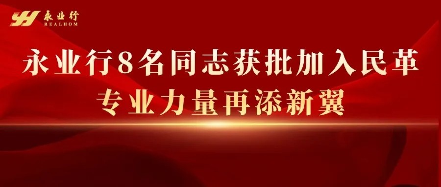 永业行8名同志获批加入民革,专业力量再添新翼 2024-12-28 近日,永业行黄长勇、赵辉、徐书杰、李保强、高海曼、冉超、黄育鹏、张涛等8名同志经民革湖北省十三届二十八次主委会议批准,正式成为民革党员,为民革组织注入了新鲜血液。 近年来,在民革湖北省委会的关怀与支持下,永业行积极推动优秀人才投身民革事业,不断加强民革党支部建设,目前已累计发展民革党员 10 人。这些党员凭借专业优势,围绕资源环境、乡村振兴、双碳等关键领域深入调研、积极建言,以实际行动展现了新时代民主党派成员的责任担当,为社会经济高质量发展贡献了智慧与力量。 作为现代服务业领军企业,永业行始终坚持党建引领、参政议政、企业经营“三结合”,将调动统战人士积极性放在重要位置, MORE